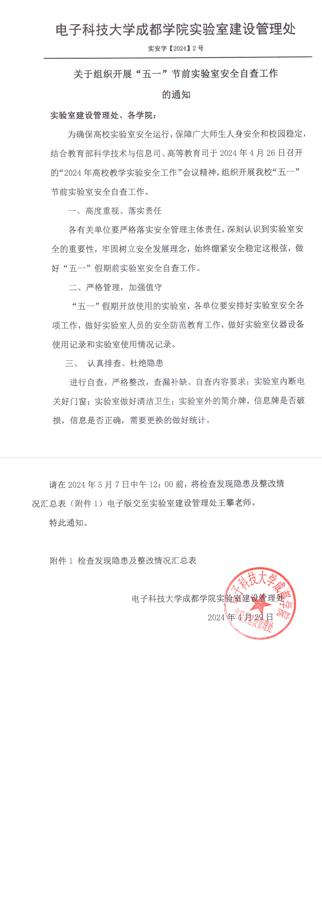 关于组织开展“五一”节前实验室安全自查工作的通知