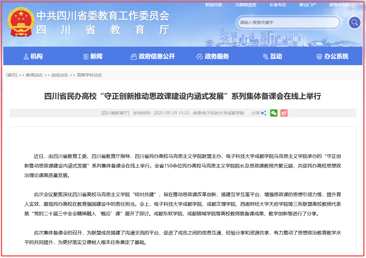 近日,四川省教育厅网站以【四川省民办高校守正创新推动思政课建设内涵式发展系列集体备课会在线上举行】为题,对我校马克思主义学院承办四川省民办高校守正创新推动思政课建设内涵式发展系列集体备课会的情况进行了报道。全文报道如下:近日,由四川省教育工委、四川省教育厅指导,四川省民办高校马克思主义学院联盟主办,电子科技大学成都学院马克思主义学院承办的守正创新推动思政课建设内涵
